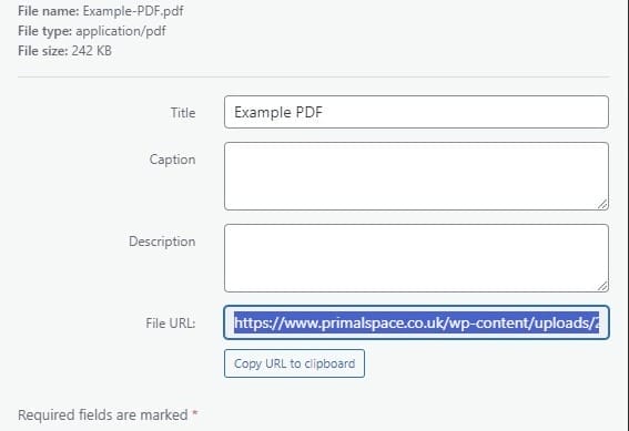 - Once the upload is complete, click on the PDF to view its details. Copy the URL provided on the right-hand side. This URL is what you will link to in Elementor. Please find an example of the link to copy from your media library highlighted in the image below.